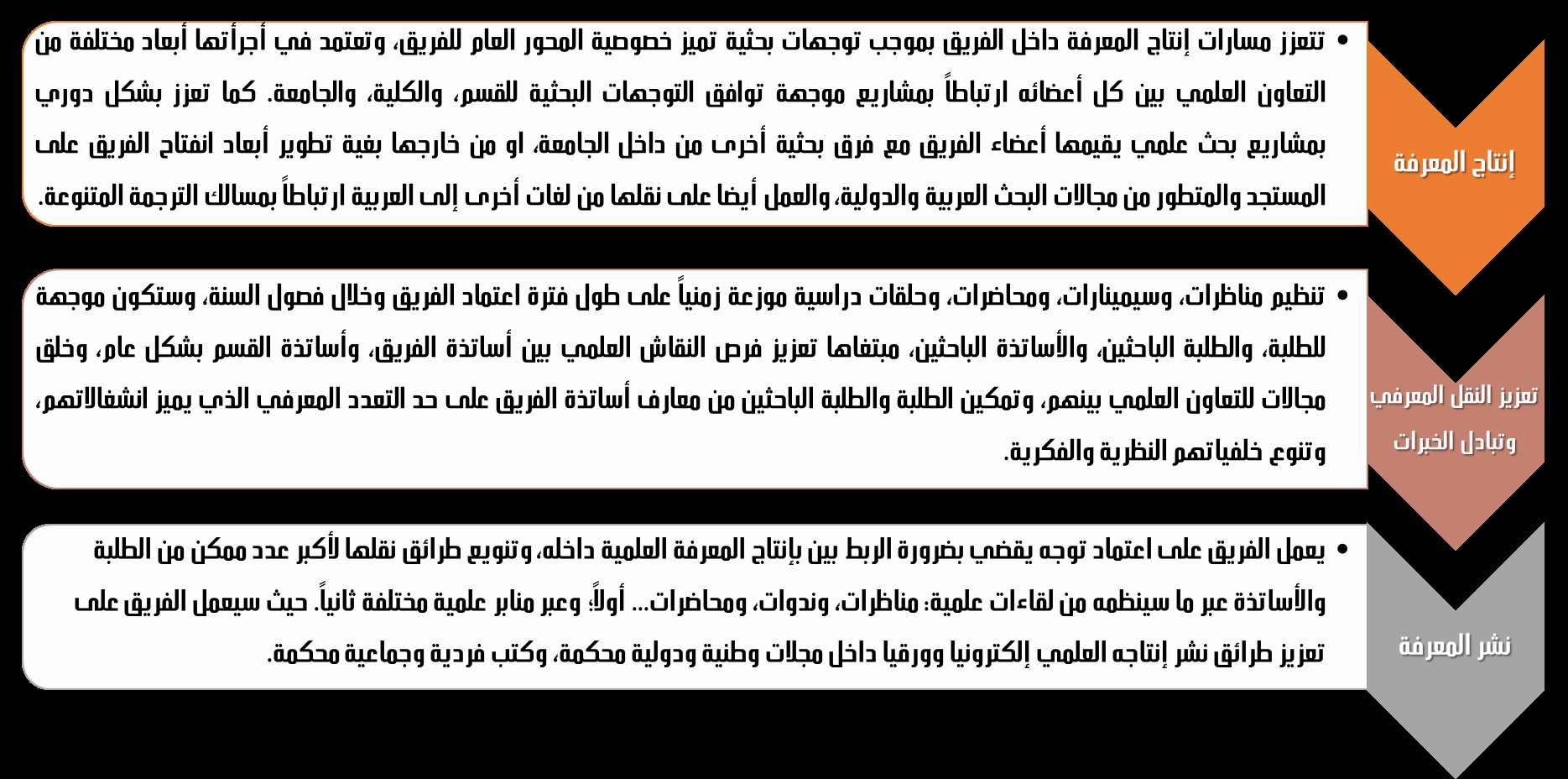 - تدعيم التفاعل والتكامل بين التخصصات والمجالات البحثية التي قد تغني طرائق البحث داخل الفريق، مع انفتاح مقصود على أساتذة باحثين من أقسام وكليات مختلفة تعزيزاً للبينية في التكوينات والأبحاث والأنشطة العلمية؛