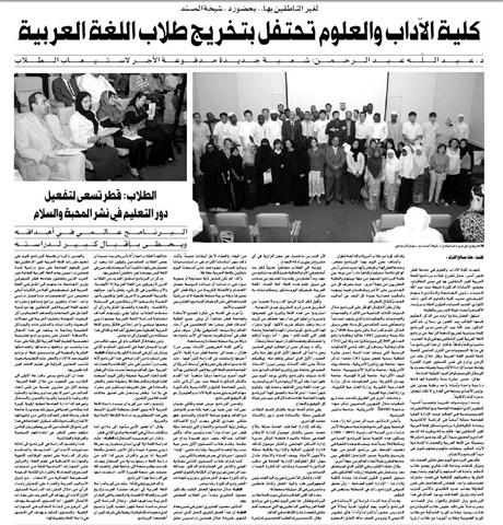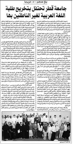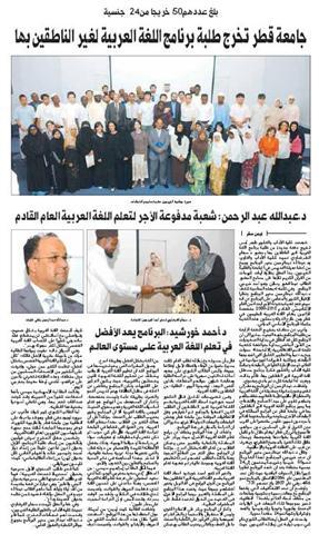 QU Newsroom - February 3, 2021 Al-Watan - August 30, 2019 Al-Arab - August 30, 2019 The Peninsular - May 10, 2019 Al-Arab - May 9, 2019 Al-Watan - March 19, 2019 Al-Arab - August 11, 2018 Gomhuria (Egypt) – February 14, 2017 Al-Arab – September 26, 2016 Al-Sharq – September 25, 2016 Al-Arab – September 25, 2016 Al-Arab – June 7, 2016 Al-Sharq – June 6, 2016 Al-Raya – May 6, 2016 Al-Sharq – May 5, 2016 Al-Arab – May 1, 2016 Al-Arab – April 25, 2016 Al-Sharq – April 25, 2016 Al-Arab – February 29,2016 Al-Arab – January 13, 2016 Al-Arab – January 6, 2016 Al-Arab - Saturday, June 13, 2015 Al-Sharq - Saturday, June 13, 2015 Gulf Times - Sunday, September 14, 2014 Al-Raya - Sunday, September 14, 2014 Qatar News Agency (QNA) - Saturday 13, 2014 Al-Raya - Monday, June 15, 2014 Al-Sharq - Sunday, June 14, 2014 Al-Watan - Tuesday, September 17, 2013 Al-Sharq - Friday, June 10, 2011 Al-Raya - Friday, June 10, 2011 Al-Sharq - Tuesday, April 12, 2011 Al-Watan - Monday, June 16, 2008 Gulf Times - Thursday, June 12, 2008 Al-Sharq - Thursday, June 12, 2008 Al-Raya - Thursday, June 12, 2008 أجانب في قطر ينقبون عن اللغة العربية فائز: إجادة لغة ثانية "صعب" بعد السنة ال13