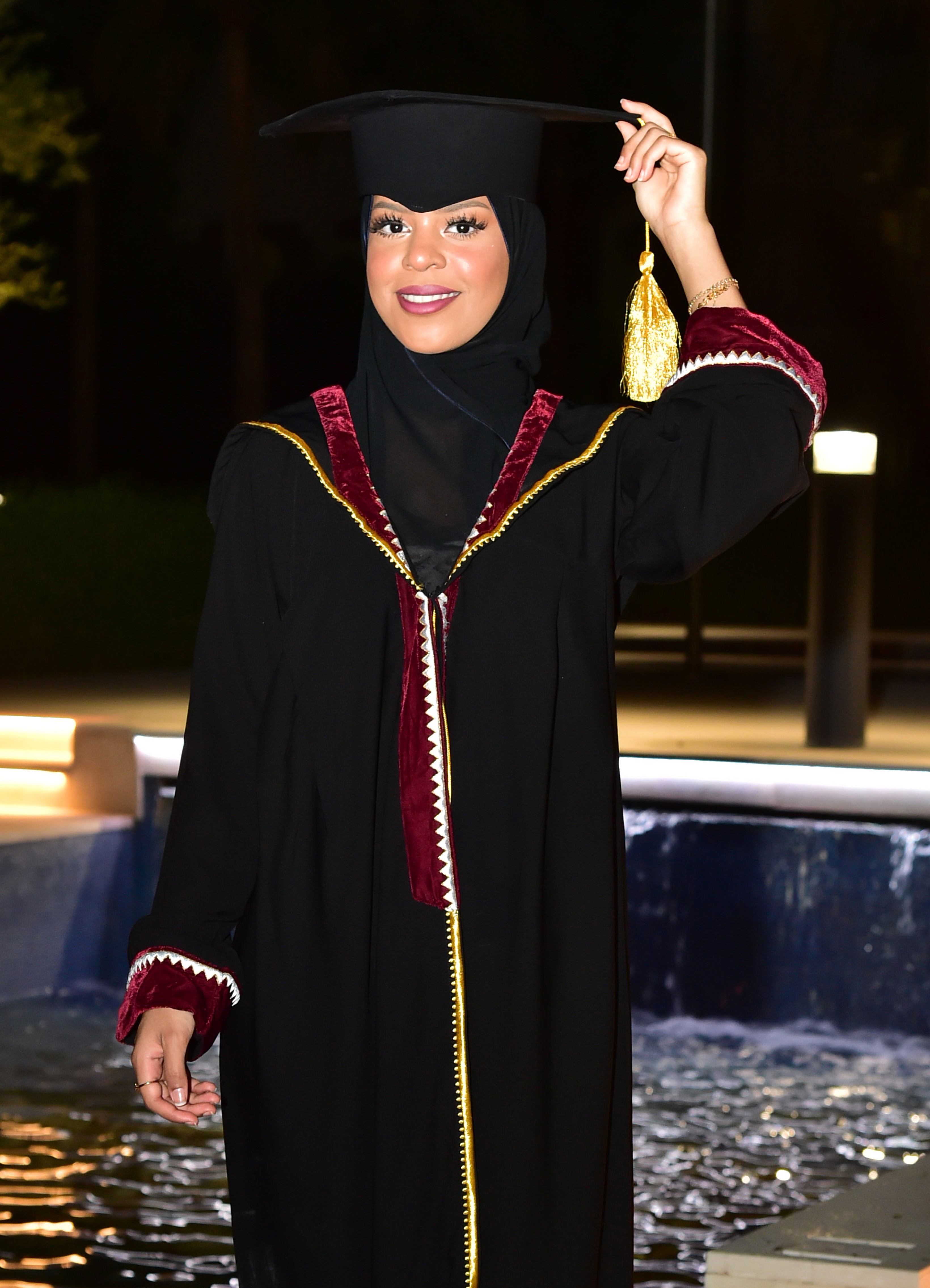 The graduation gown has been designed to combine both originality and Qatar's heritage, and features the traditional graduation gown which consists of a black gown and a black quadrangular cap. The gown cost is QR150.
