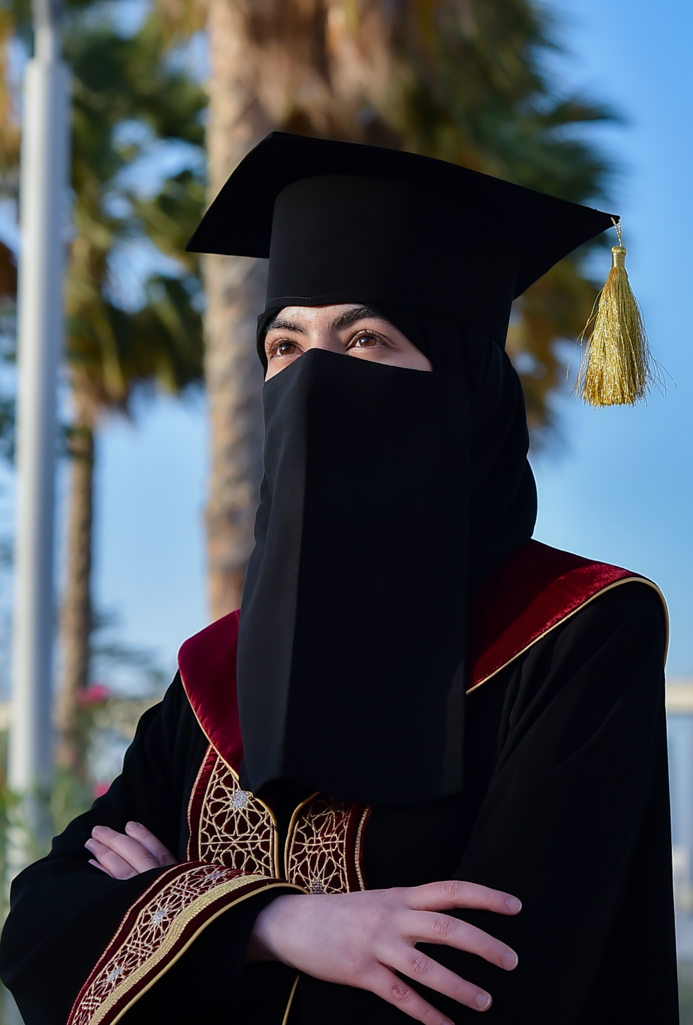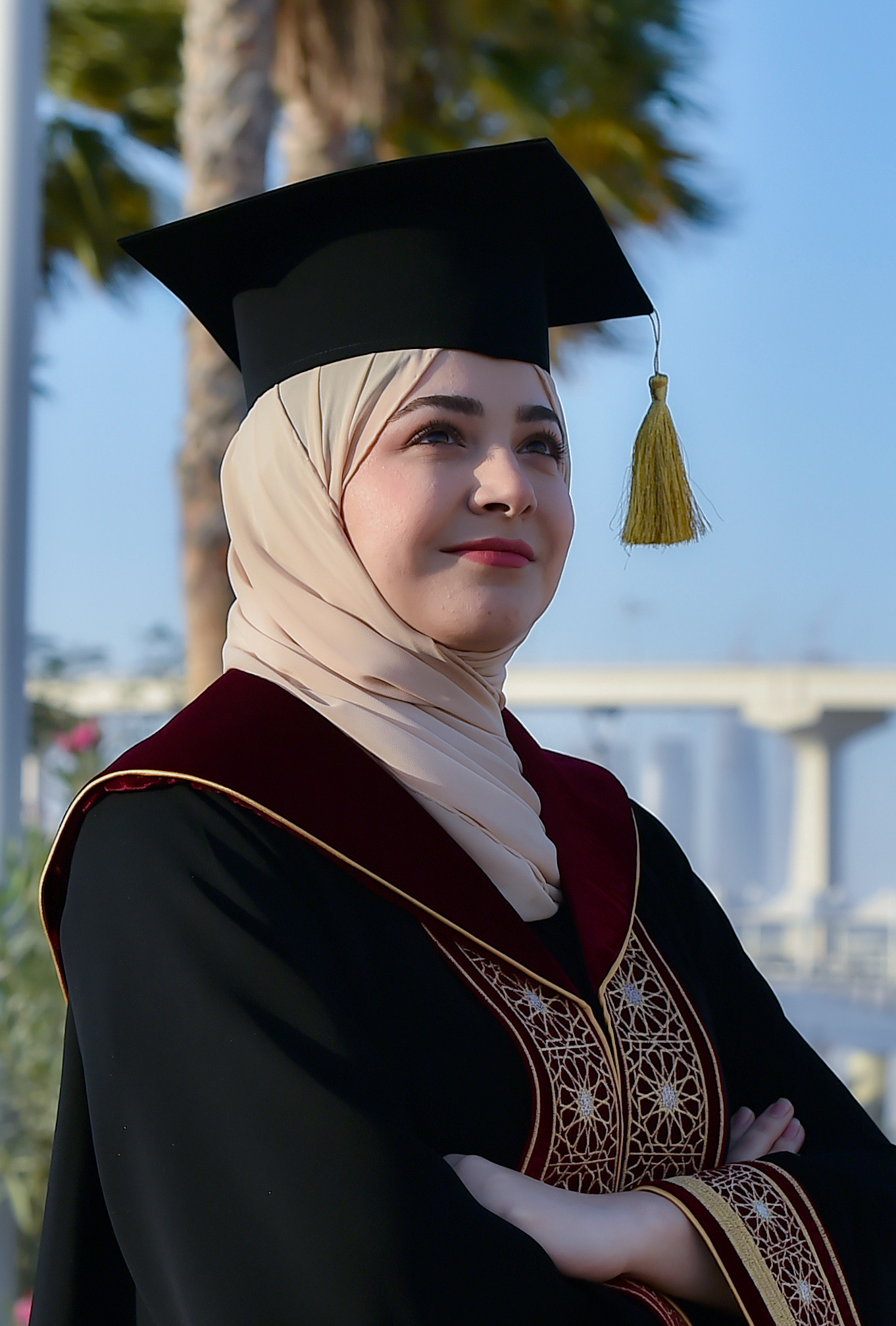 The unique design of the new graduation uniform is inspired by Qatar University’s logo which symbolizes the intertwining of Islamic/Arabic heritage with the educational system, where the embroidered geometric shapes on the graduation cloak symbolize the authentic Islamic/Arabic heritage, which forms part of QU’s logo and represents a symbol of pride, while the maroon color symbolizes the State of Qatar’s flag which corresponds to the history of the country and its civilizational dimension.