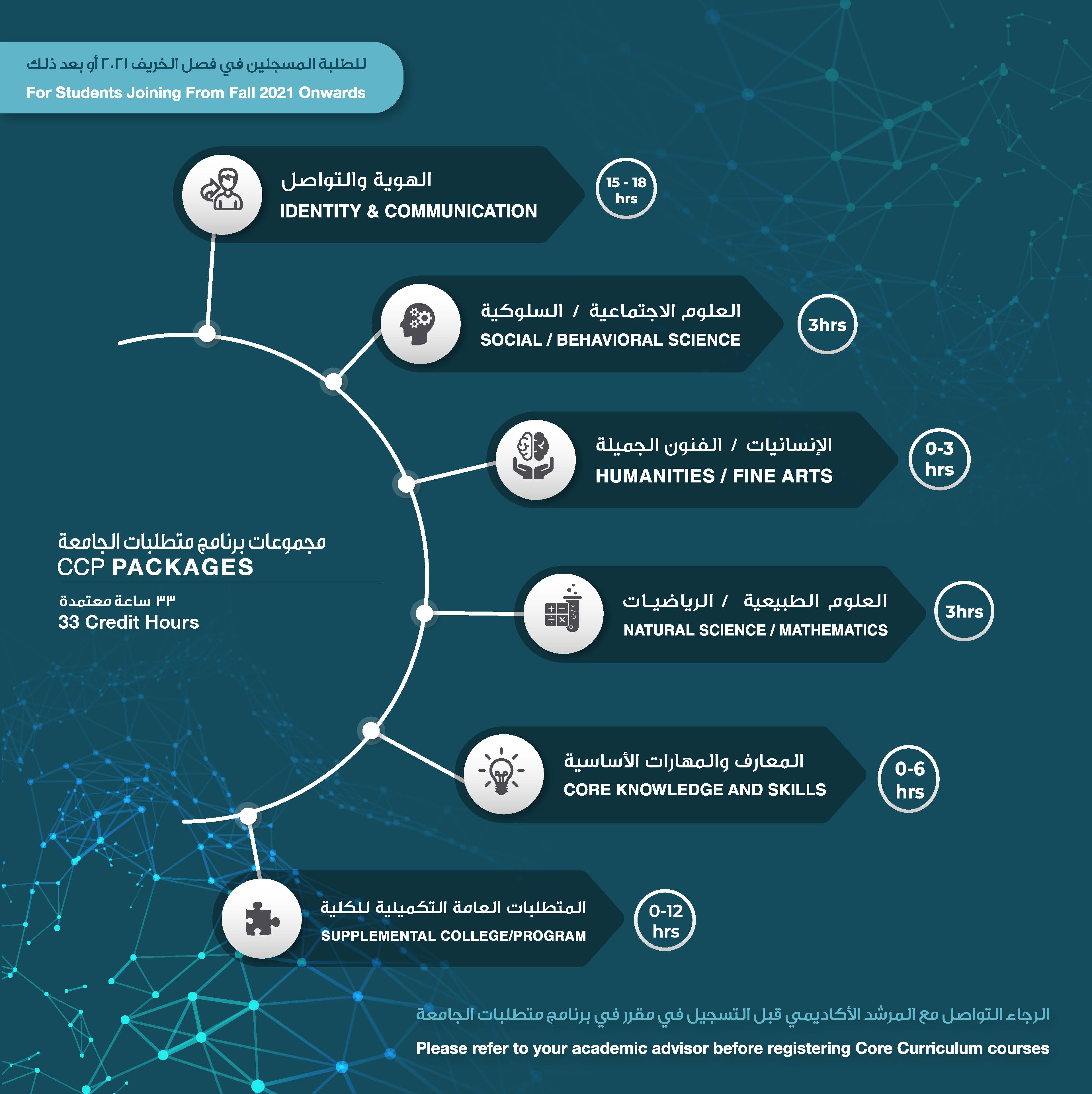 Moreover, in some study plans, depending on the major, the structure has a package titled “Supplemental College/ Program Core Requirements.” This package (0-12 Credits) may include different courses related to the mission, objectives and learning outcomes of the Core Curriculum Program.