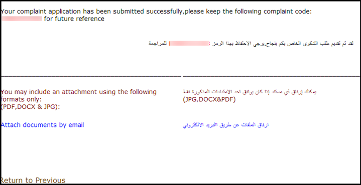 - At this step, a complaint code will appear to use in further reference. You can also attach any support documents by clicking on the link (Attach documents by email). Once you submit your application, you will receive a confirmation e-mail