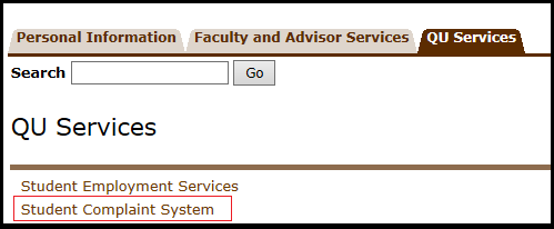 - Go to QU Services tab then Complaint System.