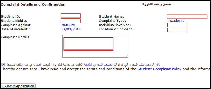 - The page below illustrates the details of the complaint to give you a final opportunity to amend the details, you should tick the term and policies box, as shown, then click Submit Application.