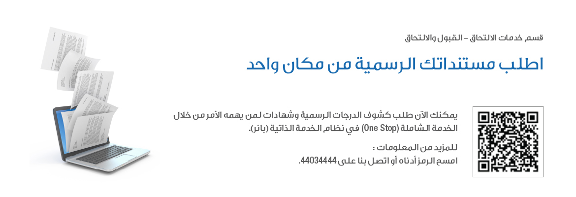 Welcome to our One-Stop offices at the Student Affairs Building (I11), we provide dedicated services for females in Room C250, while the male students area is in Room C204. Our operating hours are from Sunday through Thursday, 8:00 AM to 1:00 PM. We look forward to assisting you with your needs.
